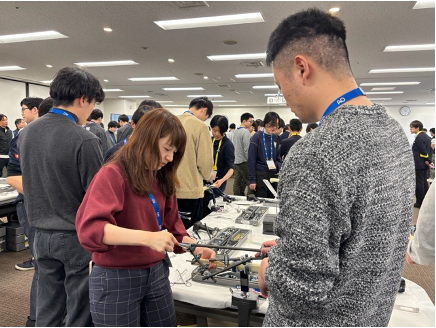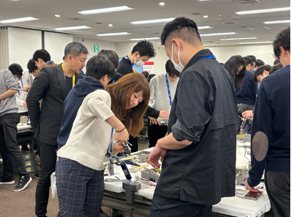 1日目の講義では、ベーシックコースということもあり、骨折治療の歴史や骨折治癒過程の基礎医学的な内容、さらに骨折治療の原則やインプラント固定の基本的な考え方を学びました。事前学習動画と重複する内容もありましたが、復習として理解を深めることができました。続くAO skills Labでは、講義で学んだ理論をボーンモデルやインプラントモデルを用いて実践的に体験しました。10か所のブースが設けられ、各ブースで担当の先生方の指導の下、骨折の作成や、ネイル径やスクリュー位置によって固定方法の違いによる安定性の変化を実感することができました。また普段感覚的に行っていたスクリューの締結力やドリリング時の発熱量を実測値として把握したことも印象的で、自身の手技を客観的に見直す貴重な経験となりました。